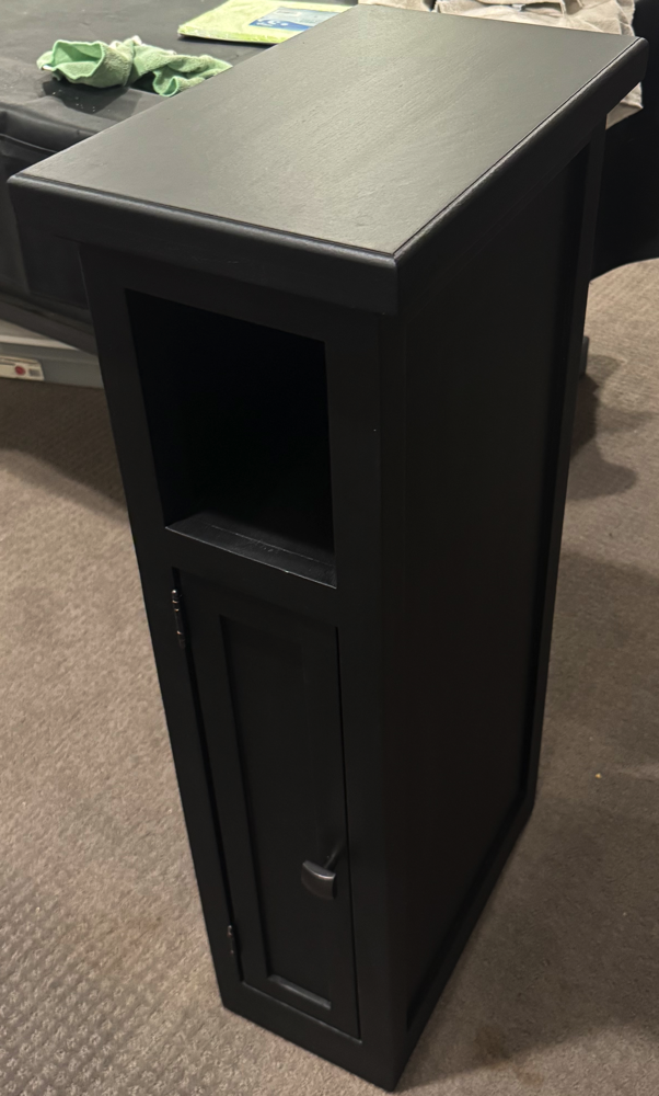 Another commissioned piece, this is a cabinet made to fit the client's narrow space in a bathroom. It features an open area, an inset door hiding two adjustable shelves and a prominent oak cap. Painted all black to match their existing decor.