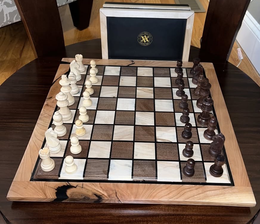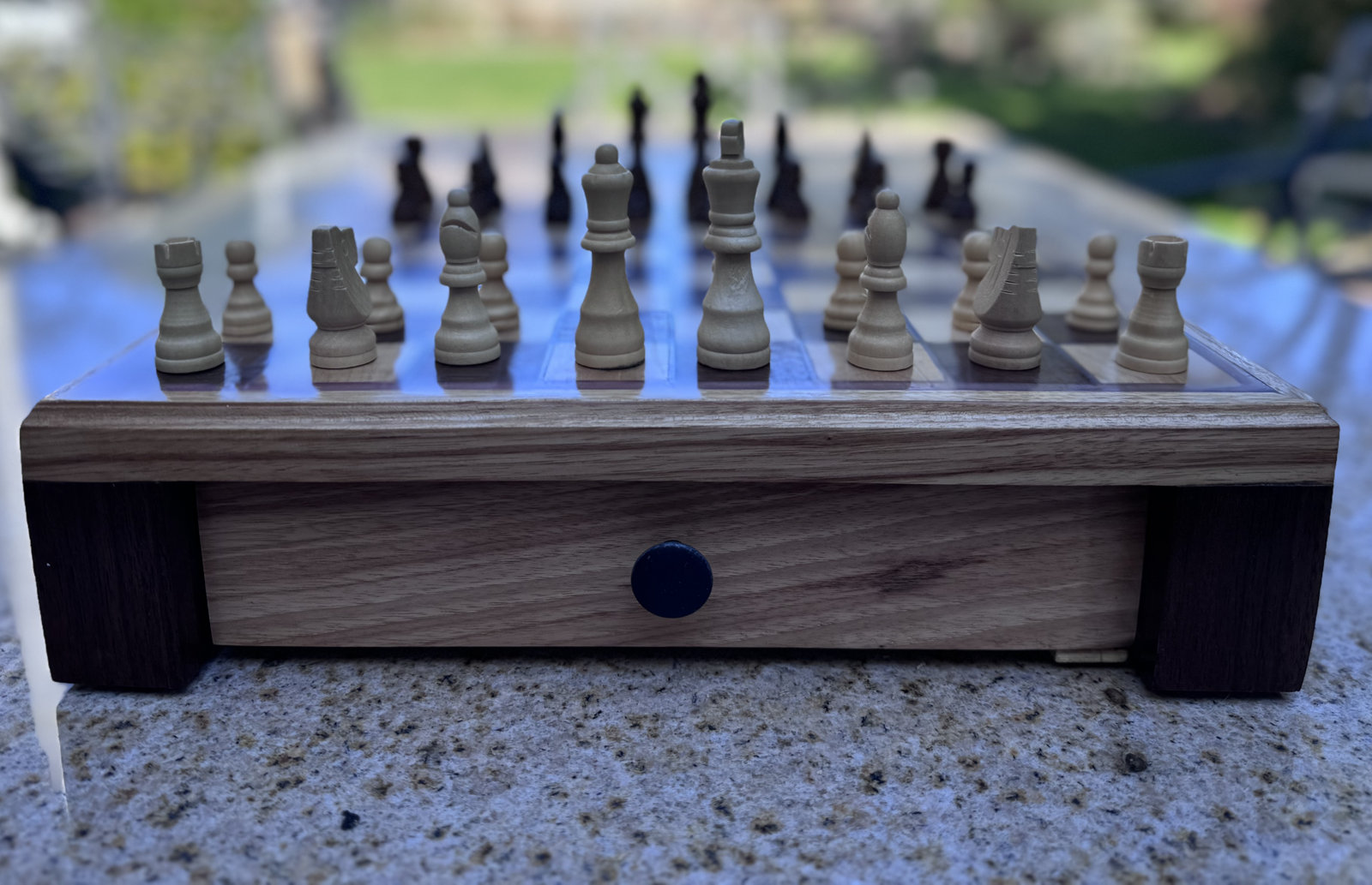 This early work is a small chess board in black walnut and maple with rose-colored epoxy highlights. It comes with an integrated, felt-lined drawer to hold the pieces. The board comes with high-quality A&A weighted pieces.