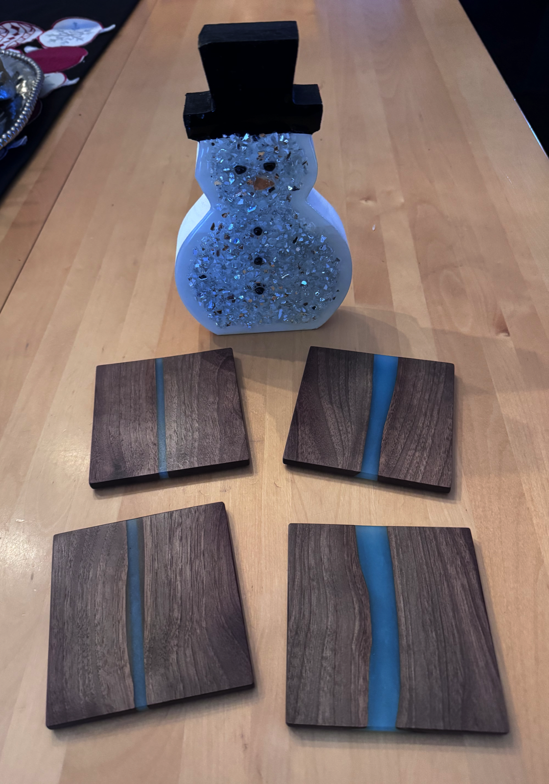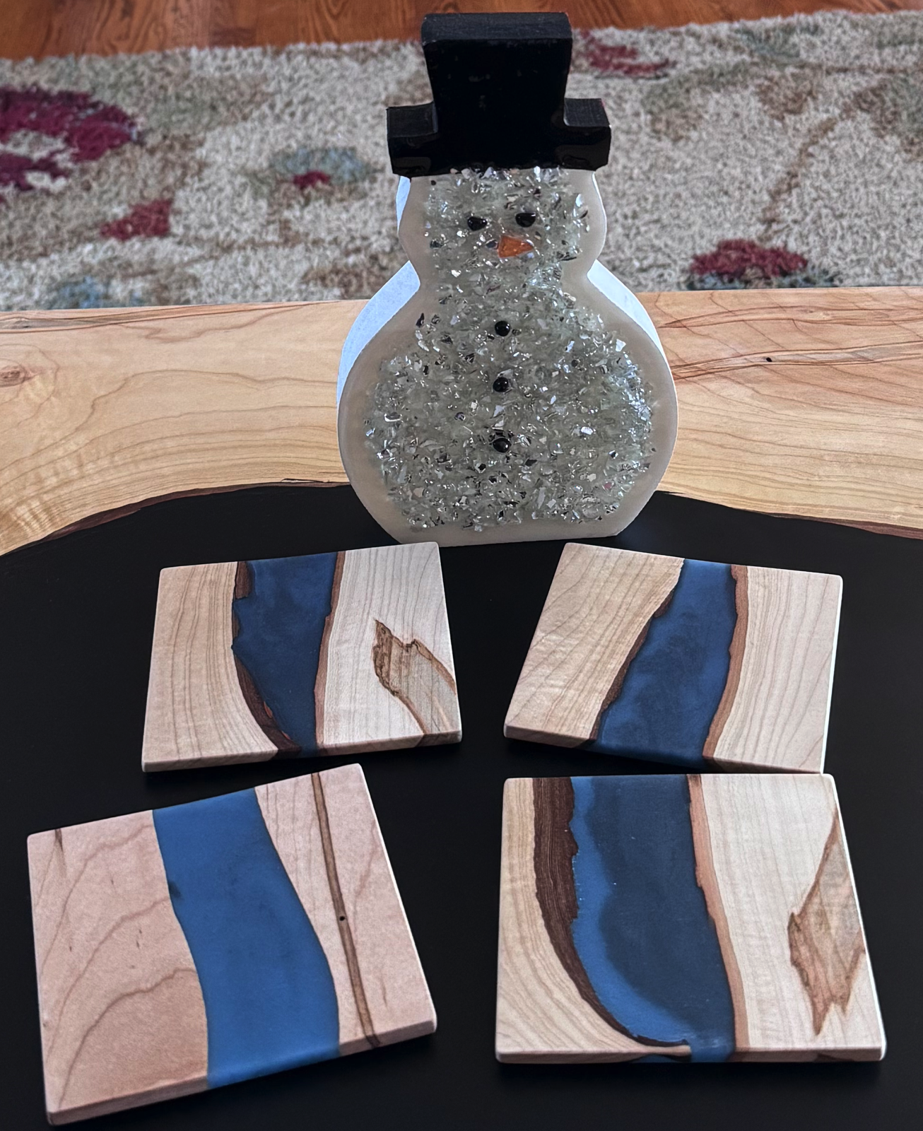 Made from beautifully figured maple and varius levels of blue-tinted epoxy these coasters really turned out nicely.