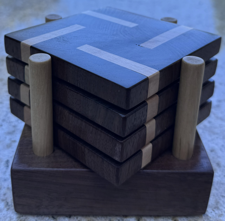 These were a set of coasters and holder I built from a client's left-over wood and gave them to the client as a bonus. All made from black walnut and maple, they turned out beautifully.