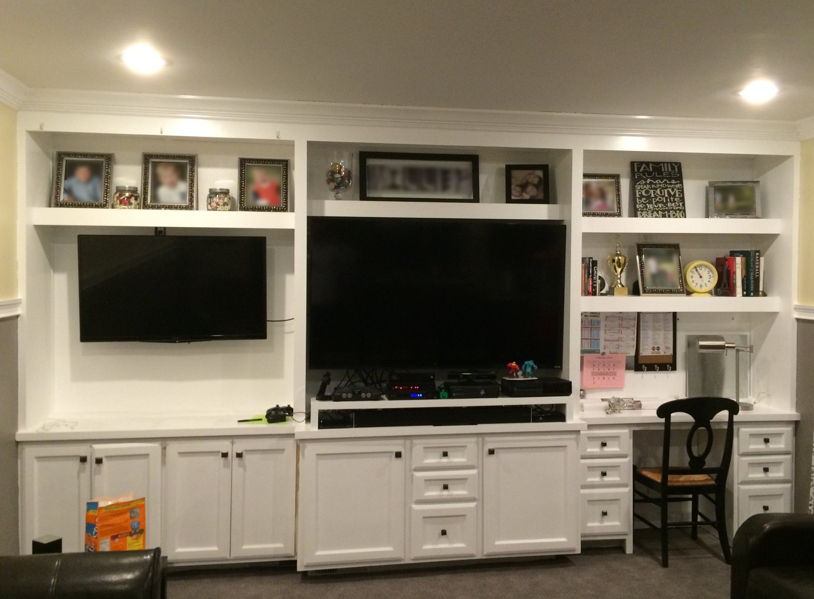 Another early project for one of my best customers - me! Removed an unused brick fireplace (we still have two others) and built this entertainment & desk center on that wall instead.