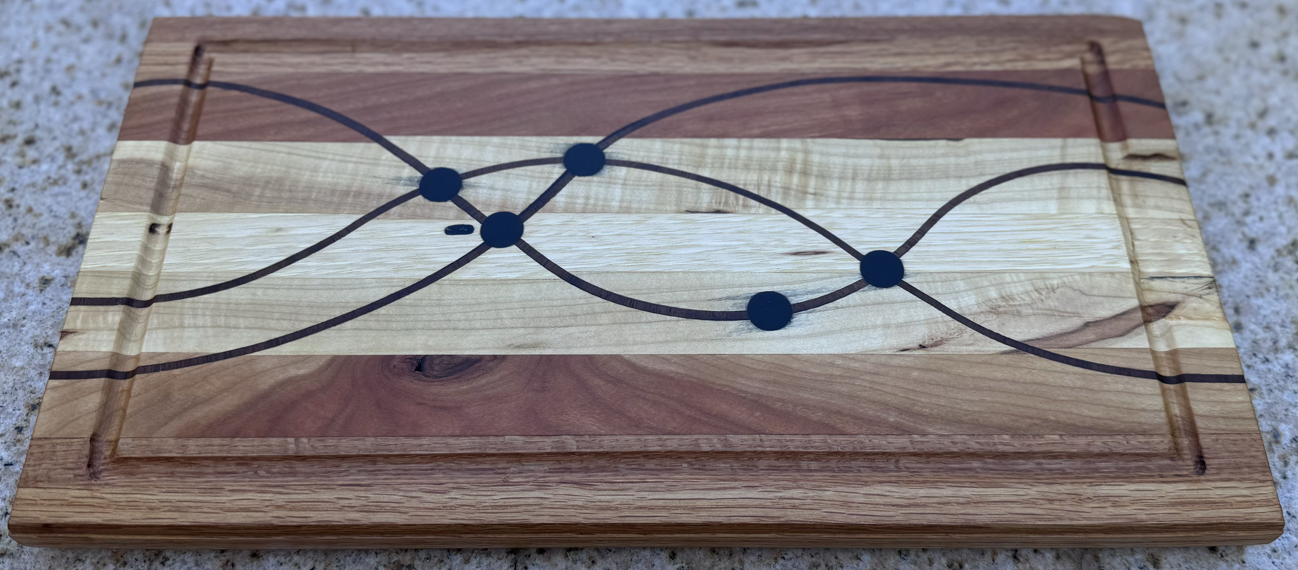 This carving board features stripes of oak, cherry and maple with decorative balck walnut inlays. The juice channel around the edge makes it perfect for preparing fruits or meats while minimizing the mess. A smaller board at about 16"x9"x5/8".