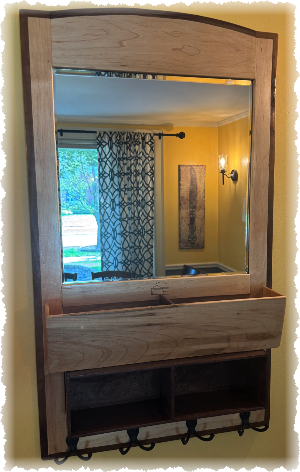 A convenient place to drop your keys and mail on the way in and one last check in the mirror on the way out. Maple framing with black walnut edges and cubby. Built for my son's first apartment, so this one is not available, but I can make one to your exact needs and style.