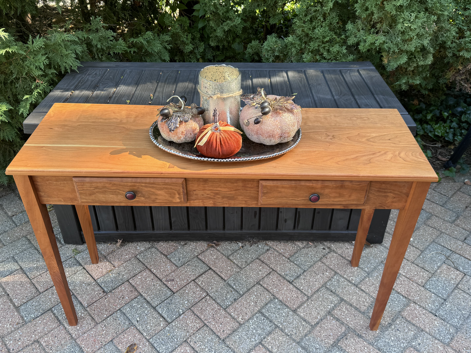 An elegant library table with two drawers in cherry wood. The cherry comes from trees removed during the Oaklind Hills Country Club renovations in 2023.