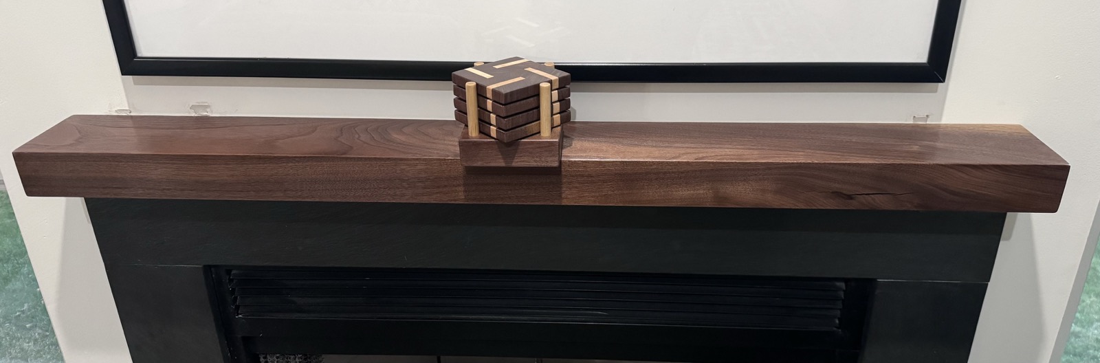 A custom fireplace mantel for a client - my first commision! Made from a solid block of black walnut with the edges only slightly eased, the final dimensions were about 52" wide, 5" deep and nearly 4" thick. Shown with a custom set of coasters and the holder made from the remains of the walnut slab and some maple.