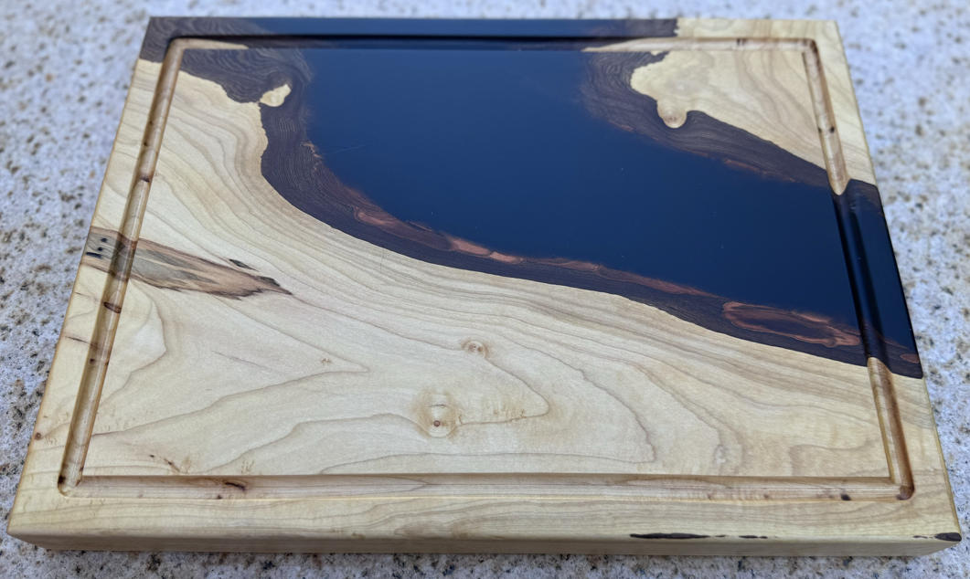 Created from a solid slab of maple with black epoxy. Finished with cutting board wax. About 16"x12"x1.5".