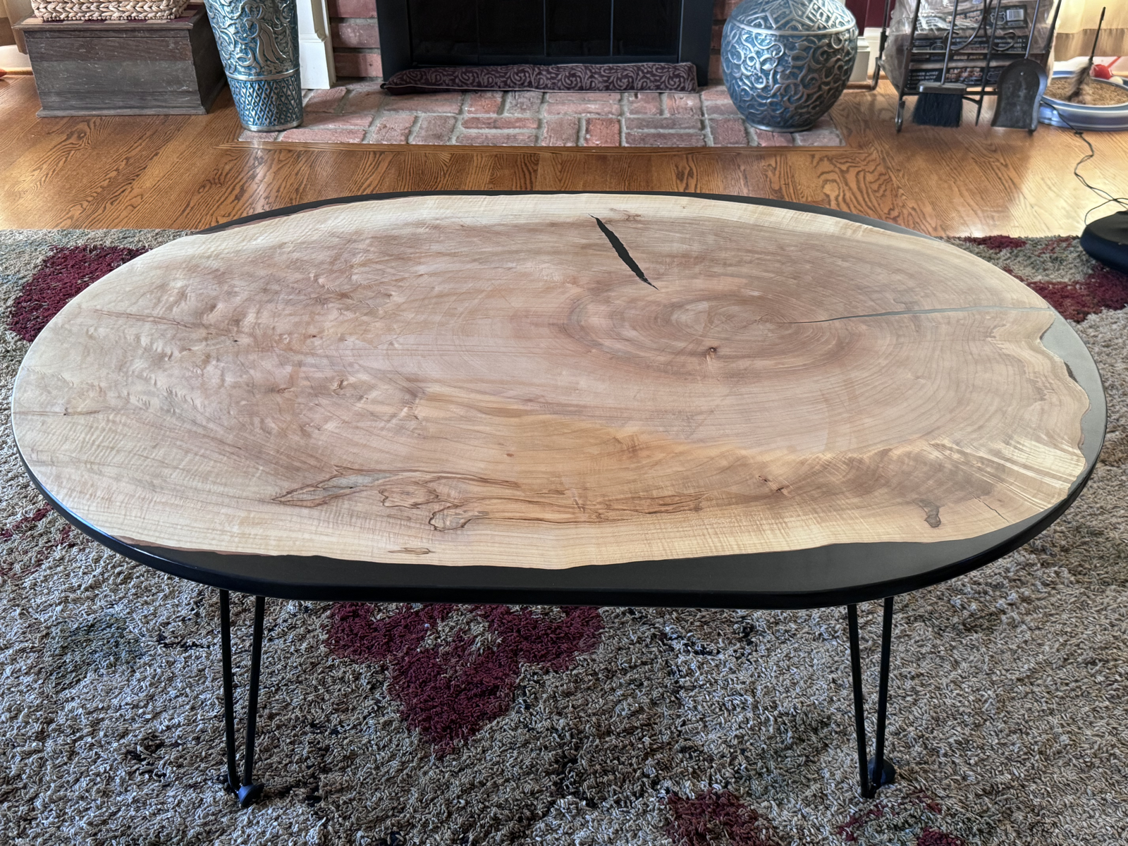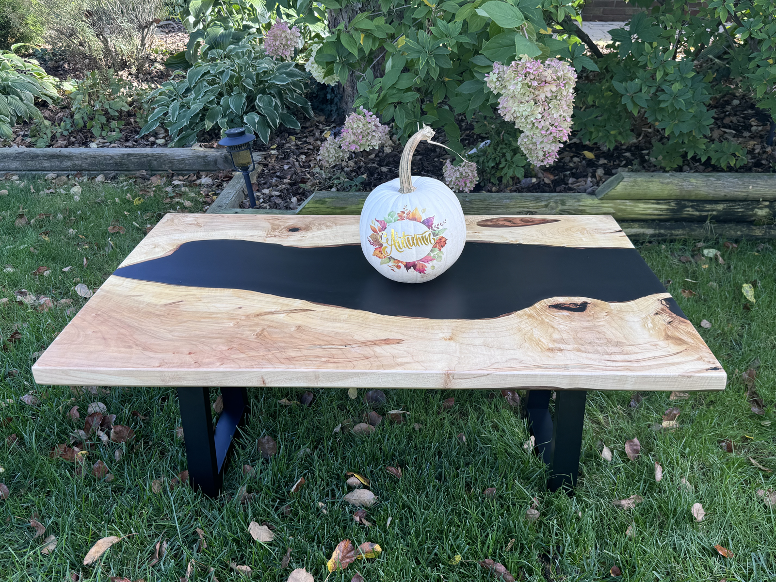 This is a beautiful maple and black epoxy "river" style table, about 1-5/8" thick. It is currently configured as a coffee table with 16" A-frame metal legs, but other styles and heights could be substituted. This slab came from the same Grosse Pointe Park neigborhood maple tree as the Oval table above.