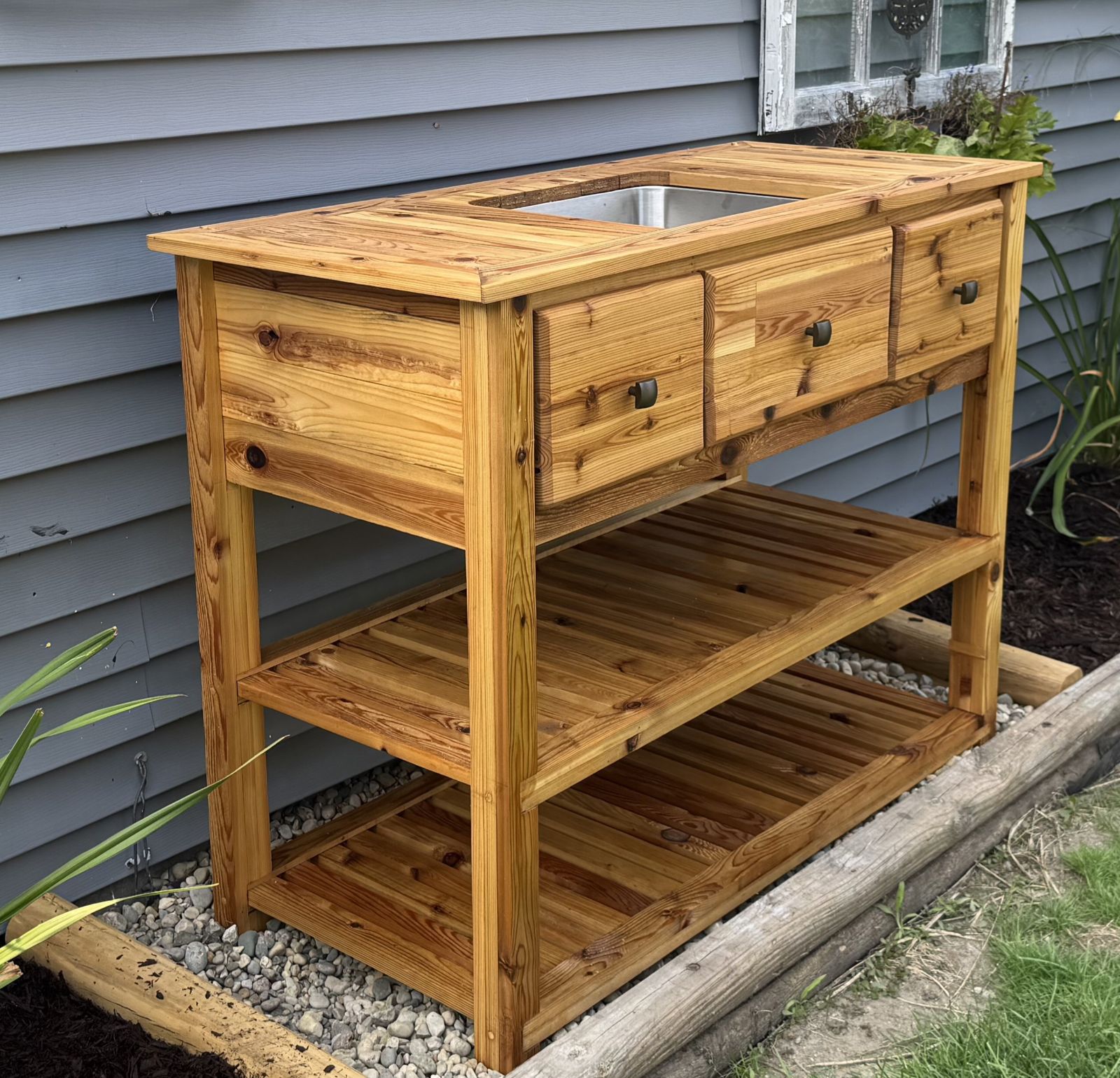 Exercize your green thumb in style with this 100% cedar potting bench. Includes a dry sink, but can easily be converted to wet with any water supply. Finished with boiled linseed oil for extra weather protection and a richer appearance this piece will darken to a deep golden brown over time. My wife loves it. Price varies with material choice and features. Contact me and we can design one for you.