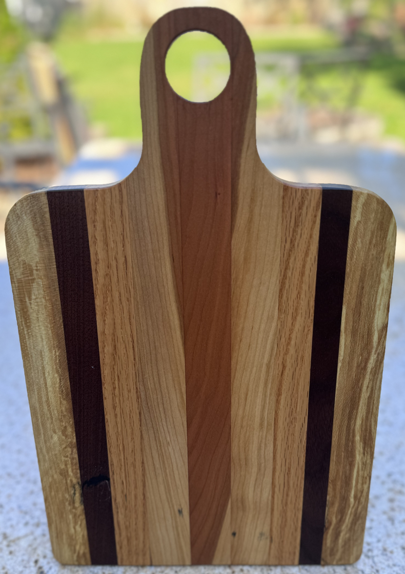 A combination of solid hardwood strips of oak, cherry, black walnut & sycamore. This colorful pattern makes for an attractive cutting or serving board. About 16"x10"x1".
